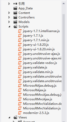 (1) 当使用Visual Studio项目模版创建新的ASP.NET MVC项目时,它会默认生成使用Jquery需要的所有内容,每个新项目中都回包含一个Scripts文件夹,里面带有很多个.js文件,各位可以新建一个mvc项目看看,如图所示: