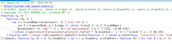 (2) JQuery核心库是一个名为Jquery-<version>.js的文件,因为我使用的VS是2012,所以Jquery的版本是1.7.1,这个文件中包含了JQuery源代码的可注释版本。还有一个Jquery-<version>.min.js文件,精简的JavaScript文件在他们的名称中包含了“.min”,顾名思义,他们占用的空间要小于对应的非精简文件(通常情况下要小一半)。他们不包含不必要的空白字符,也不包含注释,并且所有局部变量名称的长度都是一个字符,如果打开一个精简文件,你会看到一堆不可读的JavaScript代码。如图所示:
