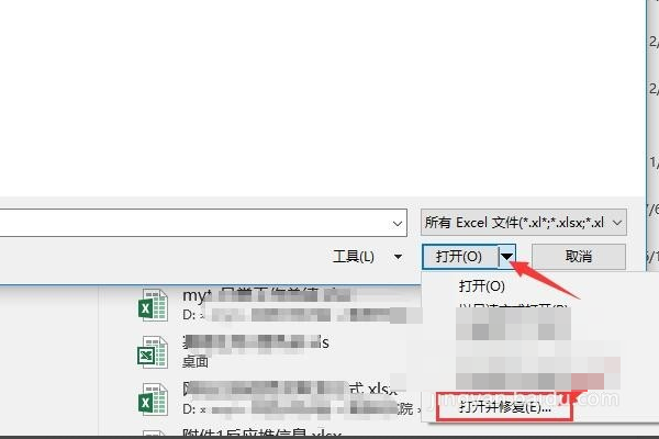 ②在弹出的“打开”对话框中选择打不开的Excel文件,然后点击右下角“打开”旁边的下拉箭头,选择“打开并修复”即可。