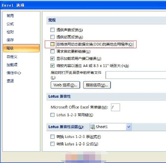 在Excel2007中的设置:选择Excel选项-->高级-->常规-->“忽略使用动态数据交换(DDE)的其他应用程序”勾去掉。