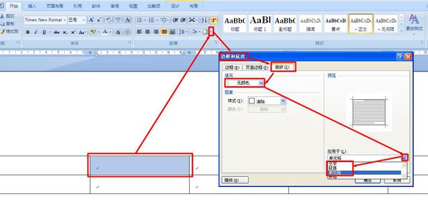 如下图,选中单元格后点击下拉菜单,选择边框和底纹→底纹→填充选择“无颜色”,然后应用于里文字、段落、单元格分别选中后并确定【三个选项前面的步骤需要重复操作】