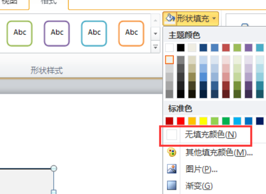 5、随后在word文档上方的“格式”菜单中点击“形状填充”按钮,点击“无填充颜色”。