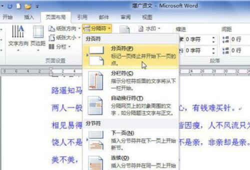 在页面布局分页符选项卡中选择插入分页符,本文以word2010为例进行演示。