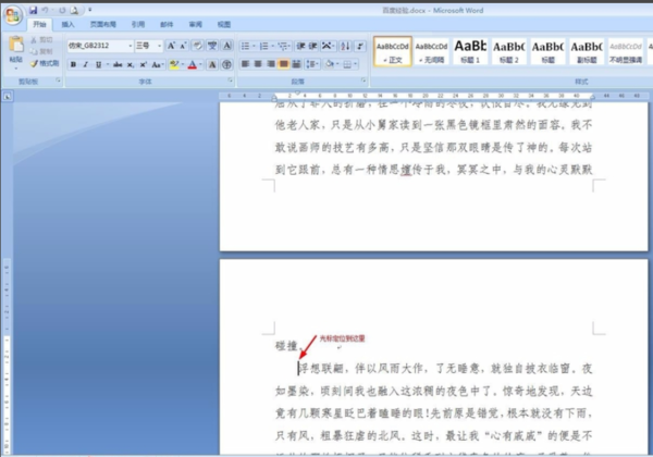 2、把光标定位在段前,如图所示,当然,也可以定位在上一段的段尾,但是必须得定位,不然word不知道你要插入分隔符的位置。
