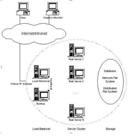 集群所能提供的服务是基于TCP/IP的Web服务、Mail服务、News服务、DNS服务、Proxy服务器等等,下面我们将就具体的产品TurboLinux Cluster Server 来实现一个进行负载均衡集群系统,用于提供Web和FTP的服务。 四台服务器的负载均衡实例