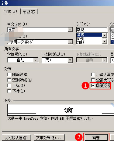 弹出“字体”对话框,在效果中勾选“隐藏”,然后单击“确定”按钮即可。