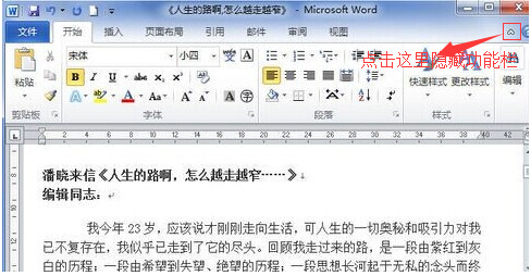 具体的方法:打开word 2010,点击右上角帮助按钮前方的三角键按钮就能切换隐藏/显示功能区。更多