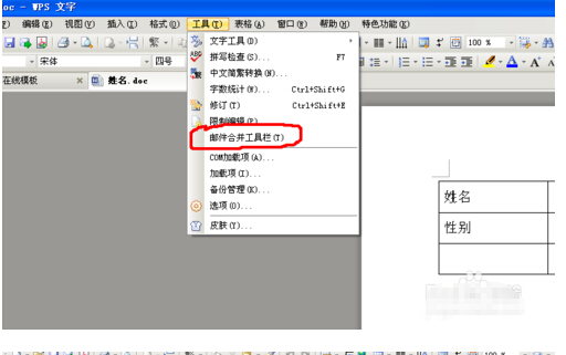 2、点击之后,就会弹出一个命令菜单,在其中找到“邮件合并工具栏”,点击“邮件合并工具栏”以后就会出现如下图2的一个工具栏了。