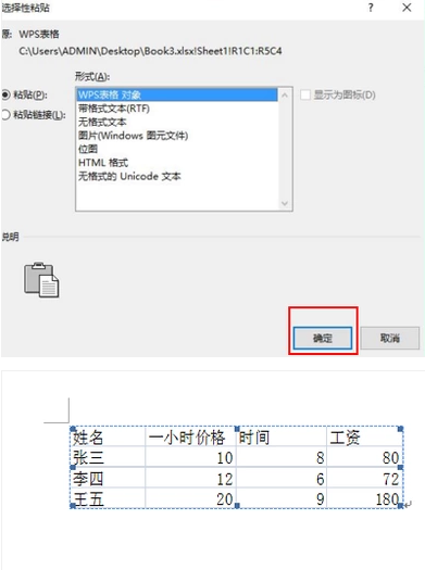 5.在新弹出的页面中核对自己的表格信息,核对无误后点击下方确定即可完成如何将excel表格导入word,如下图所示。