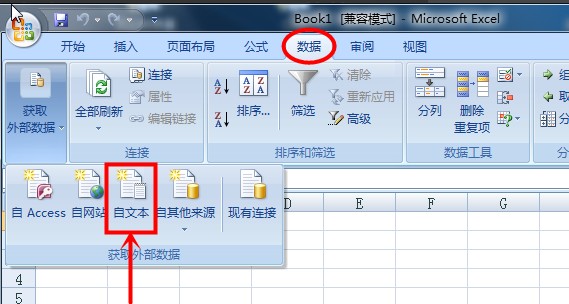 2、打开excel表格,点击“数据”选项卡,在“获取外部数据”当中,找到“自文本”。