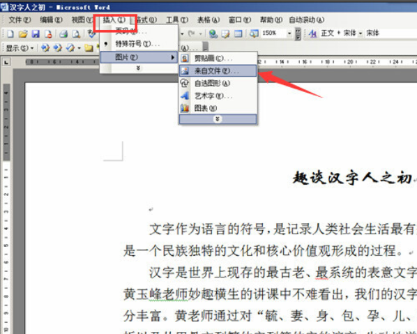 2、找到要插入图片的位置,单击鼠标,鼠标出现闪烁状态。在菜单栏点击“插入”图片来自文件”。