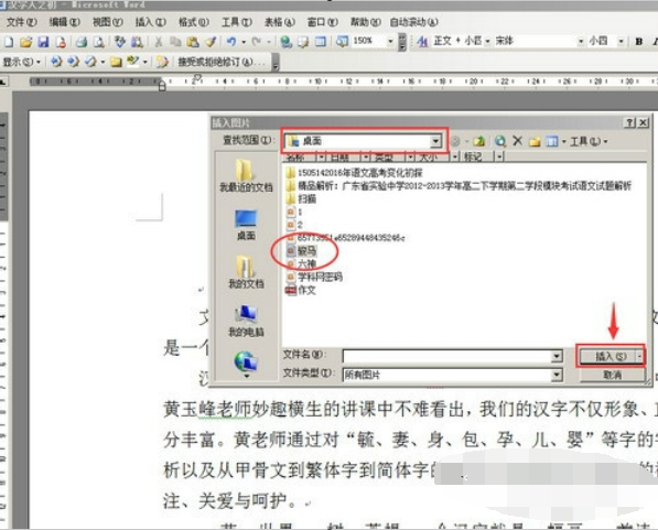 3、在插入图片的对话框中,找到要插入的图片,选中,单击“插入”按钮即可把图片插入文档中。