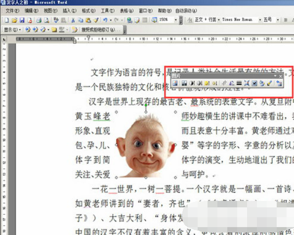 5、用鼠标选中图片,这时出现一个图片编辑器,可以按照上面的按钮功能对图片进行设置。