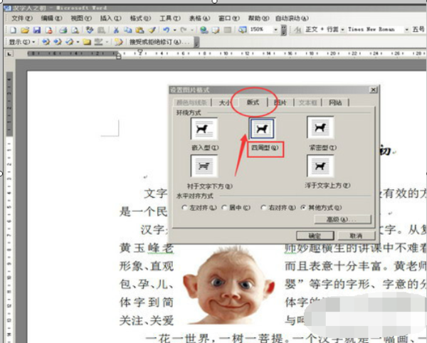 6、在设置图片格式对话框中选“版式”,选“四周型”,最后确定。