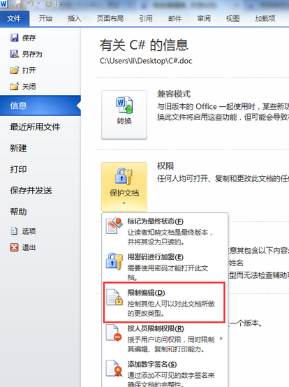 2.再点选保护文档,显示提供多种保护文档的方式,选择限制编辑选项,其它选项的有兴趣可以看看。