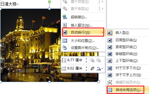 2、然后在插入的图片上右键单击弹出一个弹窗,点击自动换行后点击其他布局选项。