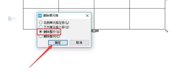 第二步,在删除命令弹出来的菜单,可以对行,列等表格进行删除,选中删除整行,点击确定即可把多余的一行删除。