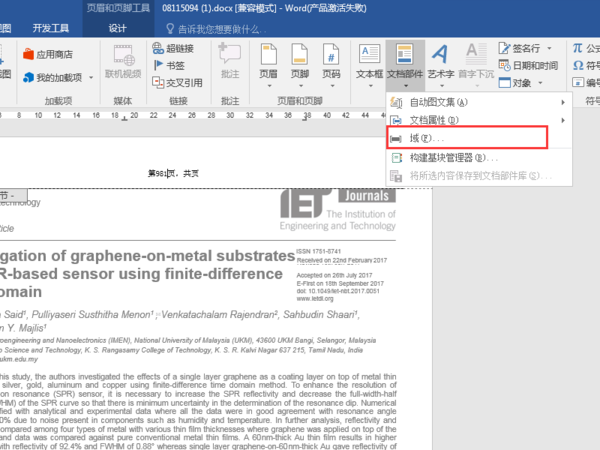 2、将光标停在“第”和“页”中间,在插入选项卡中找到并点击“文档部件”,然后选择“域”。