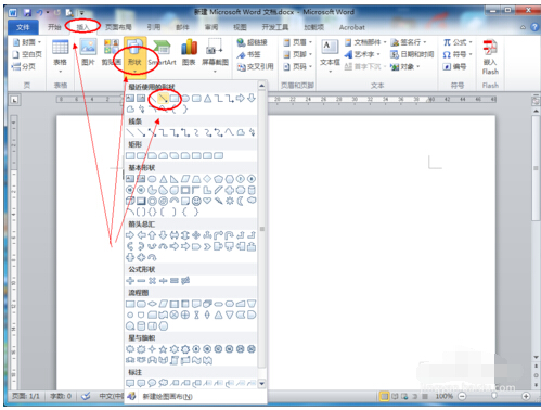 1、怎么在箭头上写字呢,跟着步骤尝试操作一遍就会了。新建一个word文件,依次点击菜单项插入--形状,在下拉的形状菜单中,选择箭头。