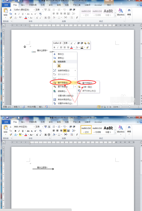 10、如上图,箭头的线条没了一部分,这只是被文本框覆盖了;右击箭头,在显示的菜单中点击置于顶层,这样箭头上就有文字的效果了。