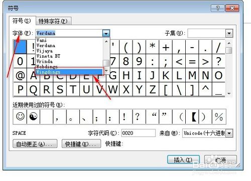 在弹出的“符号”对话框下面的“字体”选择“Webdings”;