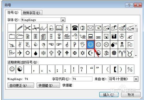 然后在下面的图标中你就可以找到一个笑脸的标志;选择后单击“插入”按钮,然后关闭对话框;