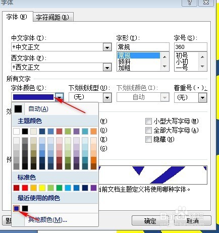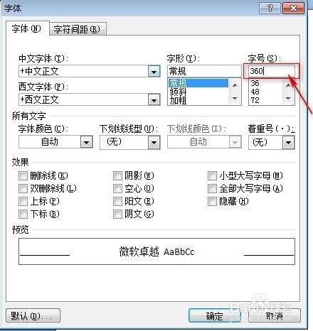 弹出的“字体”对话框里面的“字号”处输入“360”然后确定。字体大小改成360以后,标志自动就变得超大了。