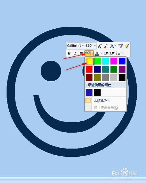 这个笑脸显得有些呆板,我们稍稍调整一下。选中图标,会自动出现背景快捷菜单,在背景颜色中选择“黄色”,然后再次选中图标,在字体颜色中选择一种你喜欢的颜色,我们这里选择“深蓝色”。效果如下。