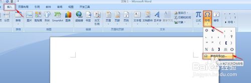 首先打开Word2007,单击菜单栏中的【插入】-【符号】选项组中的“符号”按钮,选择最下面的“其他符号”;