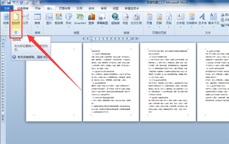 6.单击“插入”选项卡,在“页”组单击“空白页”按钮,在光标插入点前后文字间就插入了一页空白页。