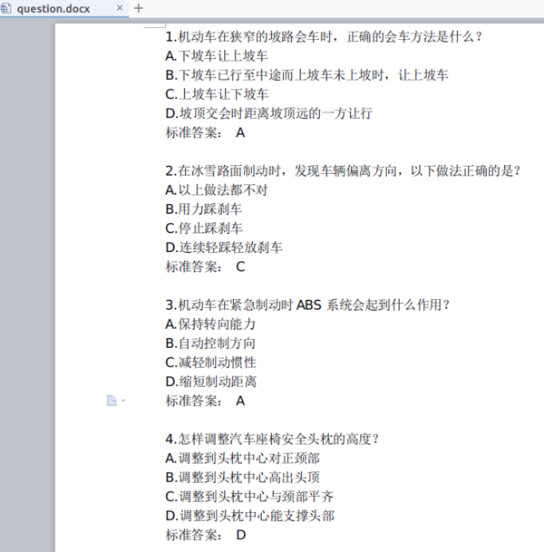 首先我这有个文档,里面包含了驾照考试科四试题。