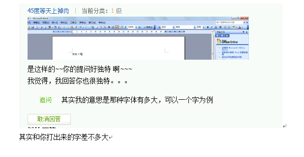 突然发现你是手机在线,不知道这么做你看不看的清楚,上面是我们刚刚对话的字体大小,相面从其实和你打出来的字差不多,是我用宋体5号打出来的,你比较一下。。。?