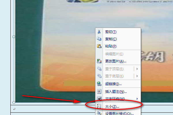 2、在word文档中找到只显示一半的图片,点击鼠标右键打开下拉菜单,在下拉菜单中选择大小选项,点击打开图片大小设置界面。