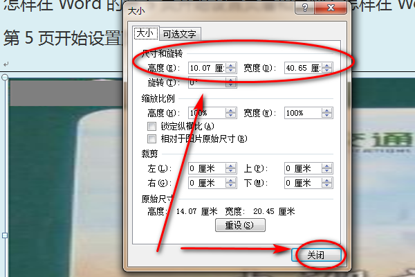3、在大小设置界面中的尺寸和旋转功能下方设置合适图片的高度和宽度,设置好点击下方的关闭按钮。