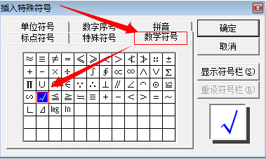 2.得到如下弹出框——特殊符号——选对号——确定,如图: