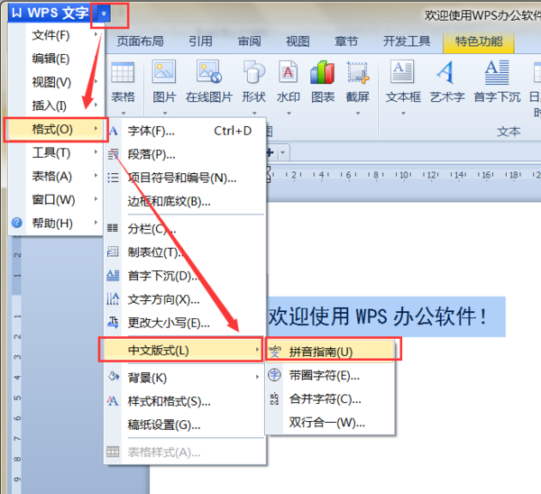 2、选择菜单上的格式–中文版式–拼音指南