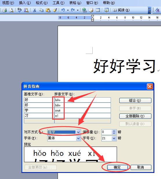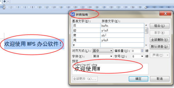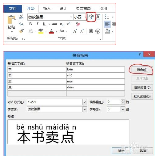 先选中要添加注音的汉字,再选择“格式→中文版式→拼音指南”选项,在“拼音指南”对话框中单击“组合”按钮,如图所示,则将拼音文字复制粘贴到正文中,同时还可删除不需要的基准文字。