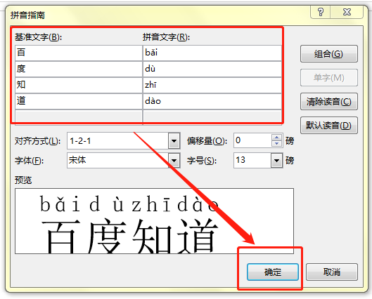 3、在【拼音指南】中输入相应内容的拼音,然后顺便将【对齐方式】选为居中,最后单击【确定】即可。