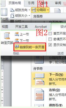 把光标放到第5页文档的最后点“页面布置”--“分隔符”下拉菜单下的“下一页”(如图1所示),把“设计”菜单下的“链接到前一条页眉”取消勾选(如图2所示),