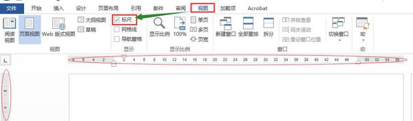 注意:视图模式不能为“阅读模式”与“大纲视图”,显示标尺最全的是“页面视图”(上,左都有),“web 版式视图”与“草稿”都只显示上方标尺。