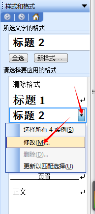 3、如果事先已经设好标题,想改标题的格式,可点击某级标题右侧下拉箭头,选择“修改”。