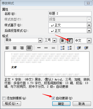 4、在“样式修改”对话框,可以对标题格式进行全面修改(这里点一下“斜体”按钮),然后勾选“自动更新”,即可使所有的同级标题都具有相同的格式。