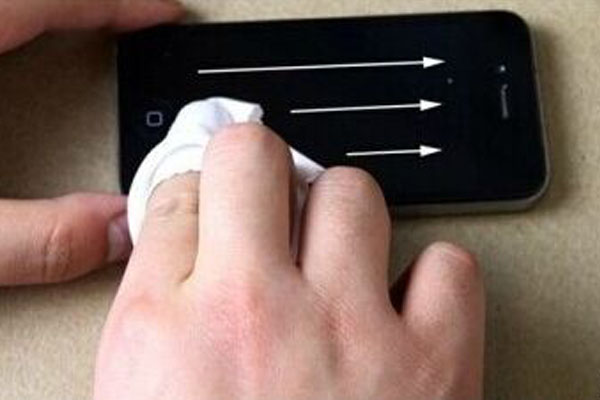 2、用眼镜布或不掉毛的软布沾少量的清水擦拭手机表面,清理干净表面的灰尘、指纹等。