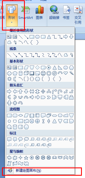 2、在“插图”分组中单击“形状”按钮,并在打开的菜单中选择“新建绘图画布”命令。