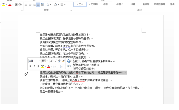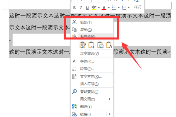 3、右击被选中的区域,在展开的菜单中可以对被选中的文字进行复制、剪切等操作: