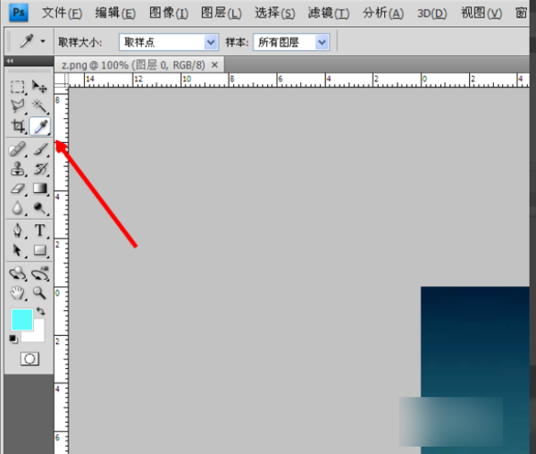 3、然后在PS软件界面中点击左侧的吸管工具(图中箭头所指)。