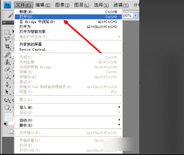 1、在电脑上打开PS软件,然后在“文件”的下拉菜单中点击“打开”命令。