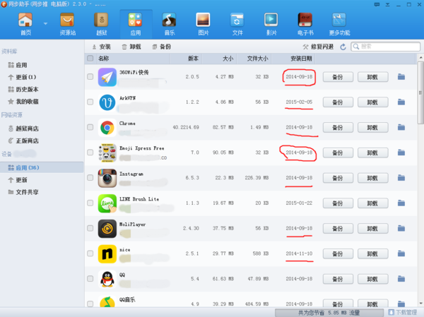 app store只查到什么时候购买过app软件时间,一般查不到你所需要的初次下载时间,因为所有软件都不断更新。不过你可以通过“同步助手”,查询到你下载安装这个软件的最新时间,如图。