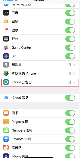 4、查看iCloud备份是否开启,若未开启,点击打开。