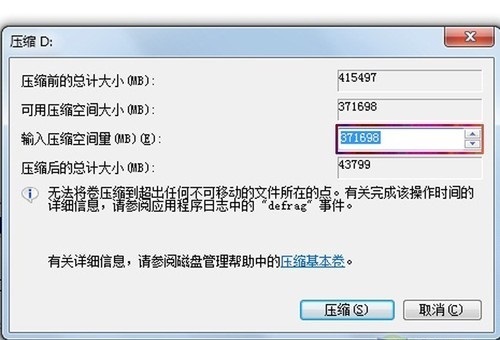 3.右键单击选择要压缩的磁盘(本例选择D盘),快捷方式选择“压缩卷”在输入压缩空间量(MB)里填写要压缩出的空间量,如果要压缩出50G,就填写50*1024=51200,选择"压缩"按钮。
